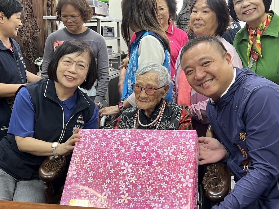 【記者張品君/台中報導】重陽節又稱敬老節,台中市副市長賴淑惠今(4)日代表市長盧秀燕關懷慰問剛滿100歲、居住在大甲區的柯莊香阿嬤,致贈市府重陽敬老禮金1萬元,並轉贈總統府及衛生福利部的金鎖片賀禮、總統府滿百歲敬老狀。賴副市長恭賀阿嬤喜迎百歲,阿嬤則分享,保持樂觀開朗平常心,自然就能夠健康百歲。