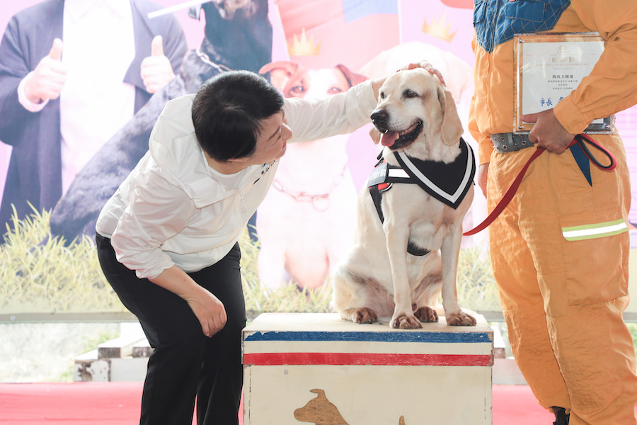 盧市長指出,「鐵雄」、「腿腿」、「本丸」分別由3位愛心人士領養,3位領養人中,有學校的志工、也有消防局同仁,她今日特別給3位養父母大大的鞠躬,謝謝他們的愛心,也希望養父母們未來可以好好照顧退休的搜救犬,給牠們快樂的第二人生。此外,盧市長也感謝金生動物醫院與全國動物醫院承諾給予3隻退役搜救犬好的健康照護,包括提供健檢、心絲蟲藥物等醫療服務。