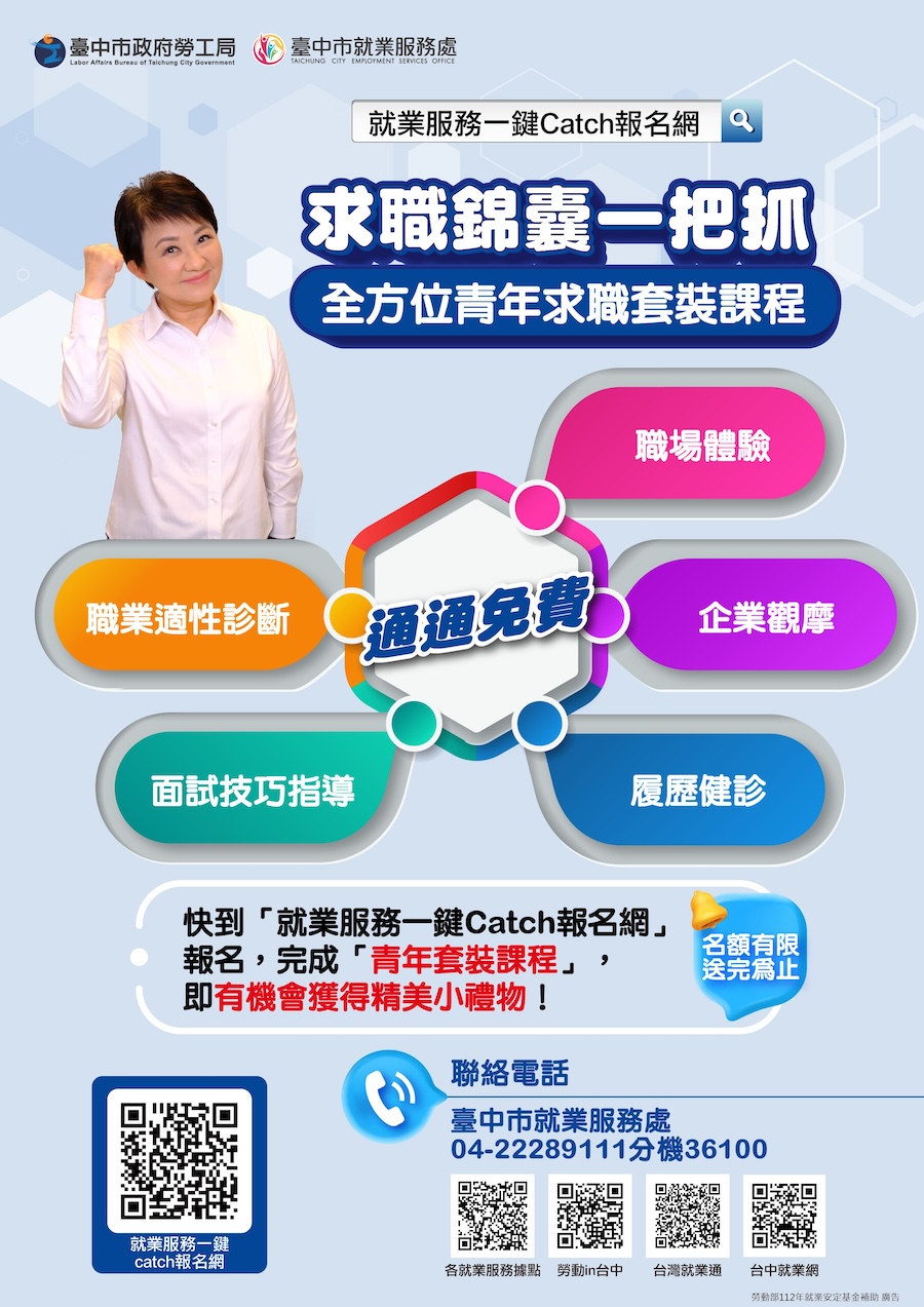 就服處說明,今年就業服務一鍵Catch報名網更針對各年齡層需求,創新推出求職套裝課程,包括「履歷撰寫」、「3C 科技運用」等一系列課程,並串聯式提供職場體驗活動,完成套裝課程者還可以獲得精美小禮物!相關資訊請至就業服務一鍵Catch報名網(https://1catchjob.taichung.gov.tw/)查詢,或電洽04-22289111分機36100、36200洽詢。