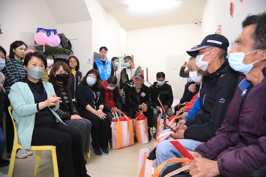 【記者張品君/台中報導】歲末年終,台中市長盧秀燕和社會局長廖靜芝今(7)日小年夜前一天,特別到「旌旗小棧」——由台灣國際禧年關懷協會設立的無家者服務據點,贈送物資福袋和發放小紅包,陪伴街友溫馨過節。「看到大家都平安,我也很高興!」盧市長與大家話家常、關心每位街友生活,更不忘提醒加添衣物,注意禦寒保暖和身體狀況,也祝福街友新的一年福運昌龍、平安健康。