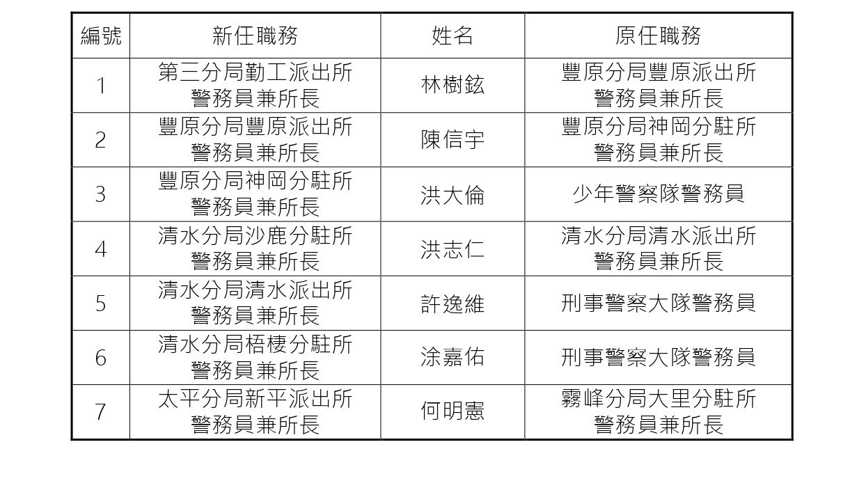 基於現階段推動治安工作需要,以有效發揮整體治安功能,台中市警局第六序列以下職缺,經參據各適任人員品德操守、陞遷積分、職務歷練、工作表現、請調意願、專業能力、職期與地區調任及適才適所等原則通盤檢討,全案核定141人並統一於113年4月1日(星期一)到任新職,其中所屬各分駐(派出)所所長職務調整35人如下:
