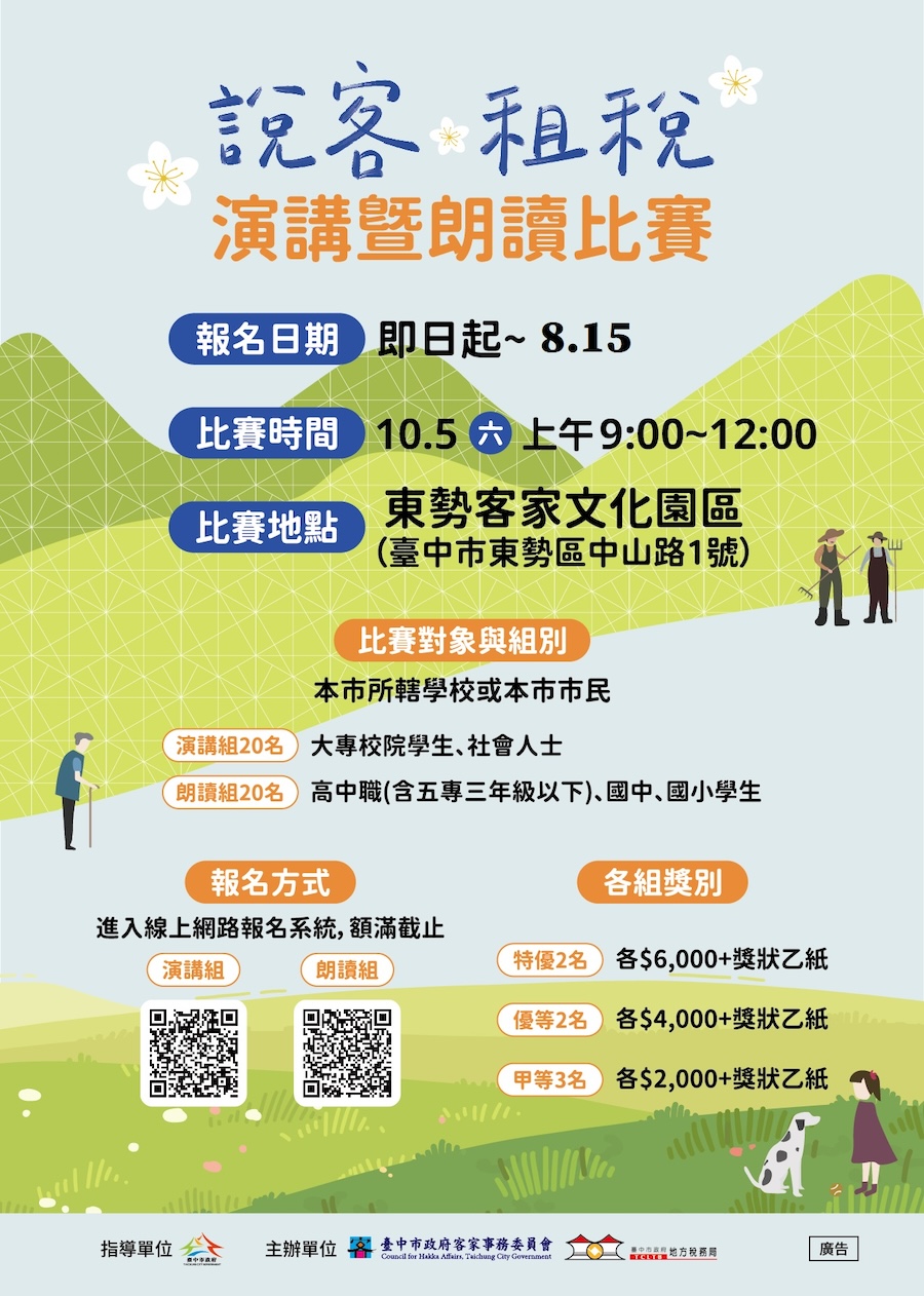此外,市府也鼓勵並提攜後生返鄉參與客家活動,如今年10月份將辦理的「『說客˙租稅』演講暨朗讀比賽」,便邀請到曾於「2022年台中東勢新丁粄節記者會」演出的台中一中客語話劇才子,現已是國立台灣大學會計系的吳泓勳同學擔任司儀,展現市府致力提攜後生,希望客家後生們在各領域都能嶄露頭角。