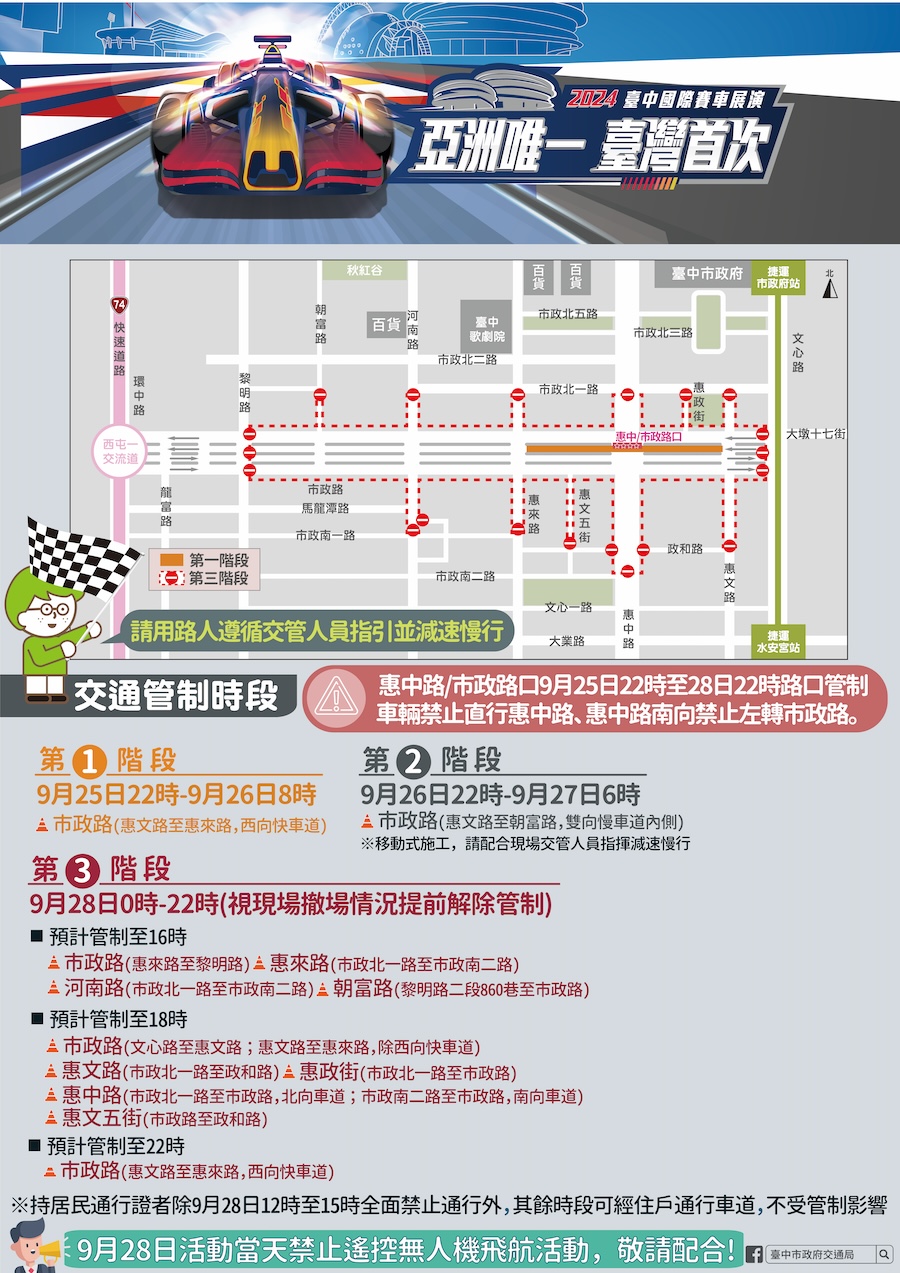 第二階段,自9月26日晚間10時至27日上午6時,活動場佈進行移動式施工,管制路段為市政路(惠文路至朝富路,雙向慢車道內側);第三階段則為活動展演及場地恢復,時間自9月28日凌晨0時起至晚間10時,市政路及其周邊橫交道路會有封路管制,管制範圍分別有市政路、惠文路、惠中路及惠文五街等路段,也會視現場撤場情況提前解除管制。