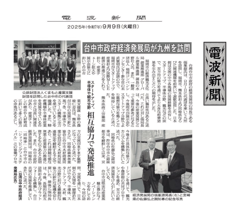 【記者劉幫寧/台中報導】台中市政府經濟發展局長張峯源於9月1日率團赴日本九州市政參訪,推動新創、半導體、林業及觀光等多面向交流。張局長表示,此行前往姊妹市宮崎縣,受到當地盛情接待,並獲日本媒體高度關注,宮崎電視台與電波新聞相繼報導,肯定台中市長盧秀燕積極推動產業發展與國際交流的施政成果。