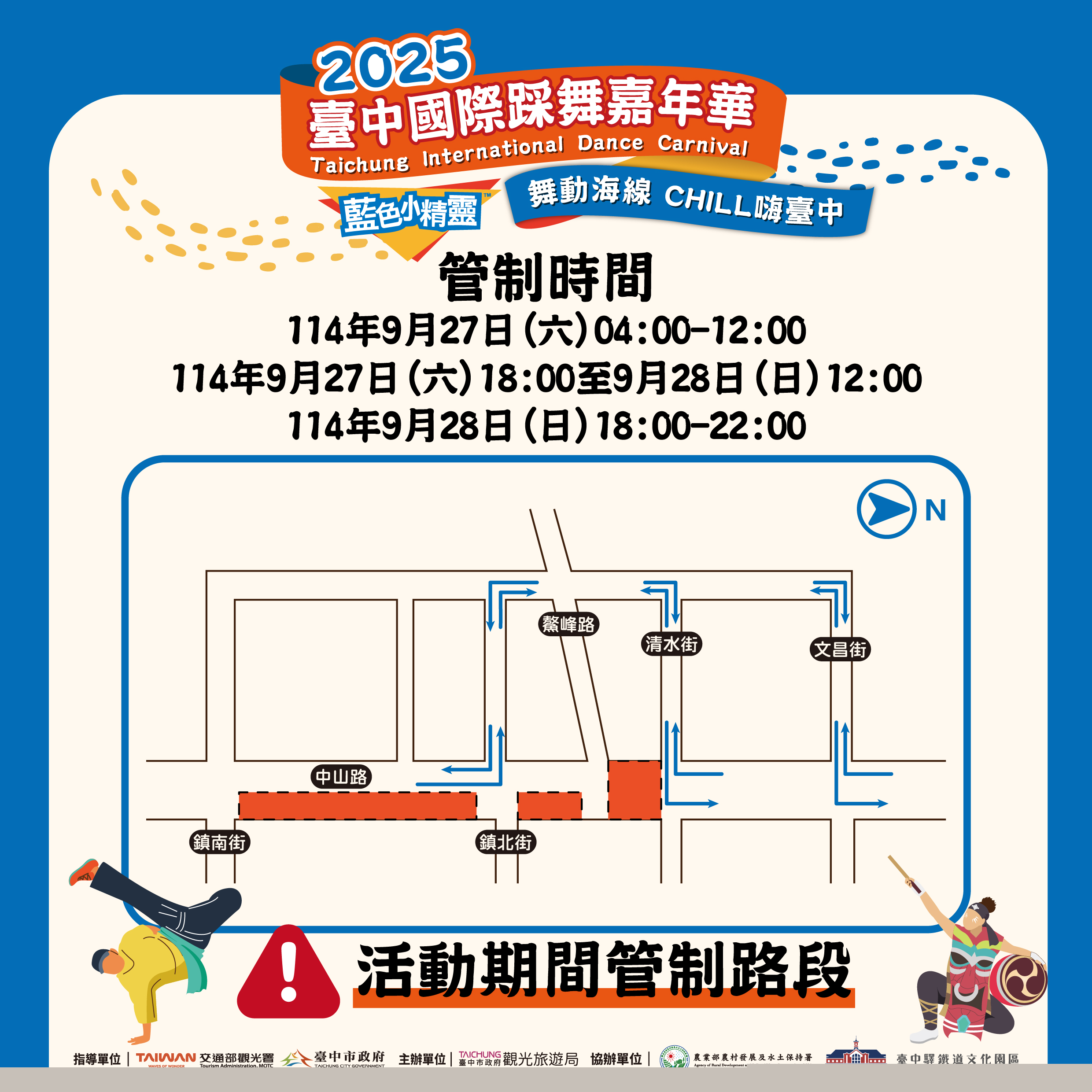 台中市府觀旅局表示,踩舞活動精神是「城市街道就是舞台」,歷屆活動辦理皆封街,讓表演團隊在街道上盡情熱舞,另為維護參與民眾及用路人安全,市府將於9月24日至9月28日借用紫雲巖前觀音廟停車場並管制周邊道路,包括大街路與中興街;9月27日清晨4時至9月28日夜間10時將管制並封閉中山路北向部分車道(南端學園街至北端董公街)、中山路南向路段(清水街至鰲峰路)封閉,中山路西邊的北寧街、光復街、文昌街、清水街、鎮北街、鎮南街、學園街於9月27日及9月28日12時至下午6時進行管制,居民通行及店家進貨等需求請向路口管制義交或工作人員提出,以對在地最小衝擊為原則辦理活動;除通行管制,也禁止停車,呼籲用路人繞道並以中華路為主要建議替代道路。
