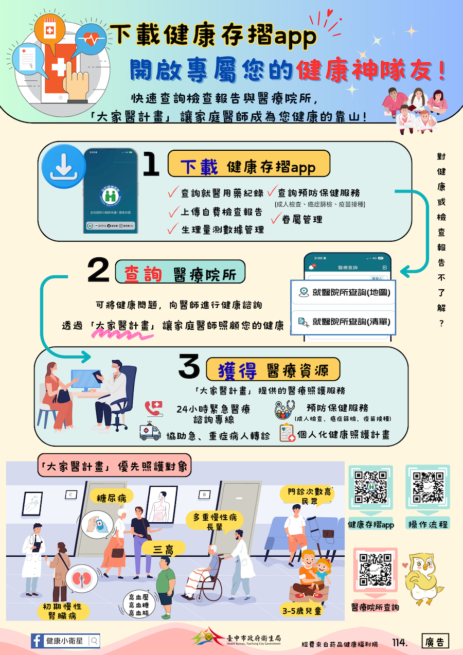衛生局補充,市民可善用政府補助的成人健康檢查(30至39歲每5年1次;40至64歲每3年1次;55歲以上原住民、35歲以上小兒麻痺患者及65歲以上者每年1次),瞭解自身是否有慢性疾病風險因子,並透過「大家醫計畫」及「全民健保快易通/健康存摺App」即時掌握就醫紀錄、檢查結果與用藥資訊,讓健康照護更智慧便利。相關資訊可至中央健康保險署查詢平台或台中市政府衛生局官網(https://www.health.taichung.gov.tw/2916872/post)查詢。