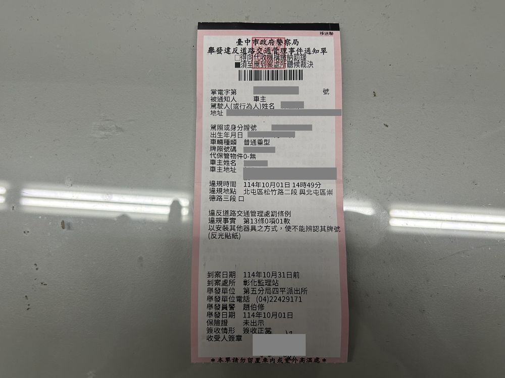 當梁男還搞不清楚警察為什麼叫住他,正要詢問原因時,只見員警蹲在他的機車後方指著車牌說「ㄟ……『劫財沒有、劫色配合』……違規!」,梁男感到一頭霧水,員警接著說「車牌上面的反光貼紙遮住了牌號,導致牌號無法清楚完整辨認,明顯違反規定」,梁男說機車是家屬的,不清楚為什麼會貼這樣的貼紙,然而違規事實明確,員警依規定舉發。