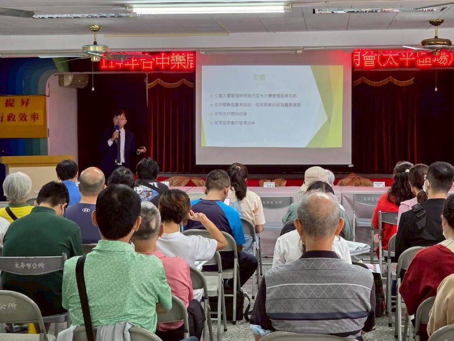 【記者劉幫寧/台中報導】台中市政府都市發展局住宅發展工程處於今(4)日在太平區公所舉辦今114年度第4場次「台中樂居學堂(公寓大廈法令說明會)」,由住宅處及太平區公所共同舉辦,近百名住戶及社區管理服務人員等報名共襄盛舉,11、12月將辦理最後2場次,相關資訊可至住宅處網站或加入台中樂居管家Line查詢。