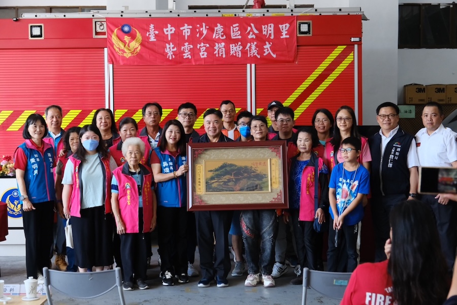 今日捐贈儀式沙由宮主蔡阿秀捐贈,消防局由局長孫福佑代表受贈,台中市婦女防火宣導隊大隊長也是現任市議員吳瓊華也到場共襄盛舉。