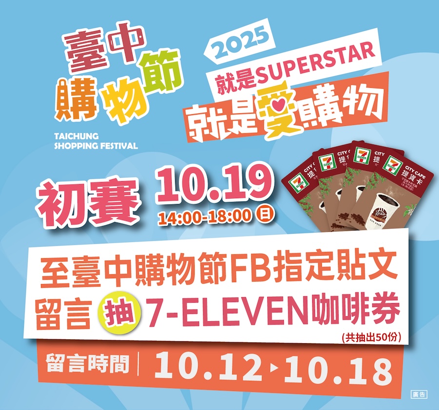 經發局補充,25組入選作品的加碼抽獎活動將於10月 12日至18日於購物節臉書展開,只要完成按讚、留言指定內容,就有機會獲得咖啡券。另10月19日在廣三SOGO舞台登場初賽,每組將有3分鐘時間呈現創意,爭取晉級決賽的資格,最後將選出20組角逐總獎金,首獎高達 10萬元;此外,來到活動現場完成指定任務還可拿抽獎券參加摸彩,邀請全民揪團到場,共同感受這場創意與熱情的盛會!更多活動資訊請持續關注台中購物節臉書粉絲專頁( https://www.facebook.com/shoppingtaichung )。