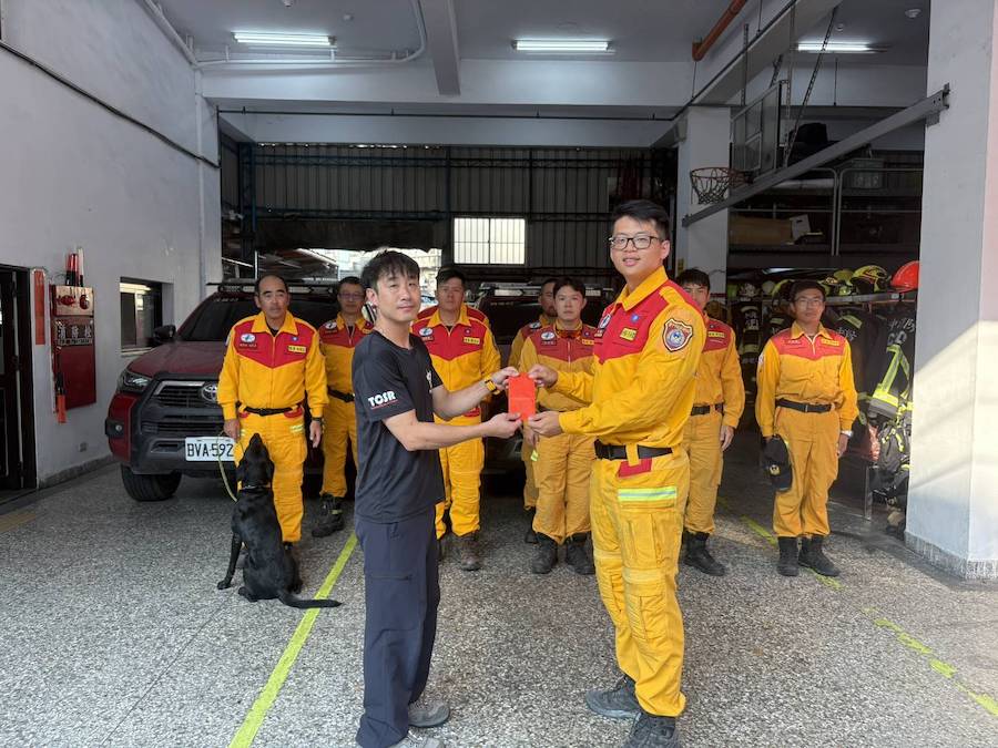 今日特搜隊任務完成平安返隊,由特搜大隊大隊長潘德倉代表迎接,義勇消防總隊西屯分隊及義勇消防總隊搜救分隊也特別頒發加菜金,慰勞特搜隊員們這幾天的辛勞。