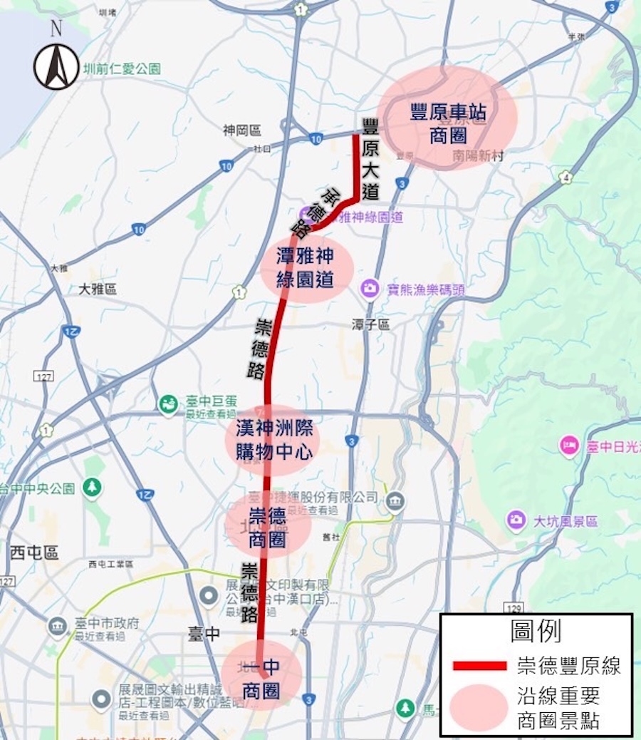 市府捷運工程局長蘇瑞文表示,紅線主線段路廊行經北區、北屯區、潭子區、神岡區、豐原區等行政區,作為串聯服務台中核心與豐原副都心主要路廊之一,沿線服務一中商圈、崇德商圈、漢神洲際購物中心及台鐵豐原車站等,行經眾多重劃區,可提供觀光與基本旅運需求,進而帶動市區觀光及經濟發展,滿足通勤、通學需求。