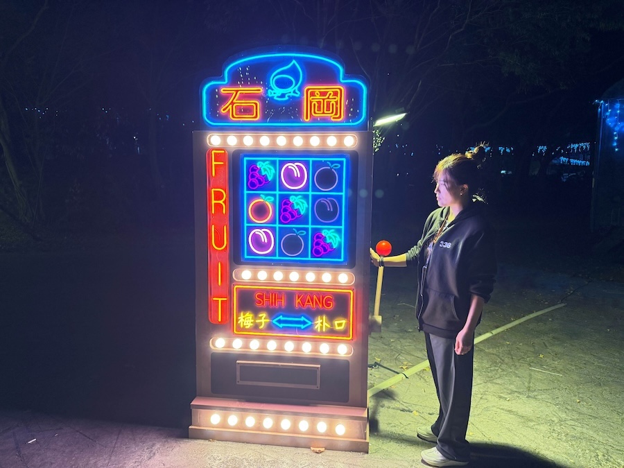此外,「果鄉漫遊」燈區以復古遊戲場景為靈感,打造趣味十足的拉霸機裝置,並設置滿載葡萄、柑橘與柚子的「石岡號」,呼應藍皮火車上的鮮果燈飾,展現山城農產的甜美生命力;石岡橋則化身為「橙香光橋」,暖橘與藍綠燈色如霧光流動,並延伸至區公所前方光影長廊,營造浪漫夜景;和盛公園「繽紛蝶境」以蝴蝶、生態與森林為主題,綠光與幻紫光交錯,宛如走進會呼吸的光影森林,靜謐而迷人。