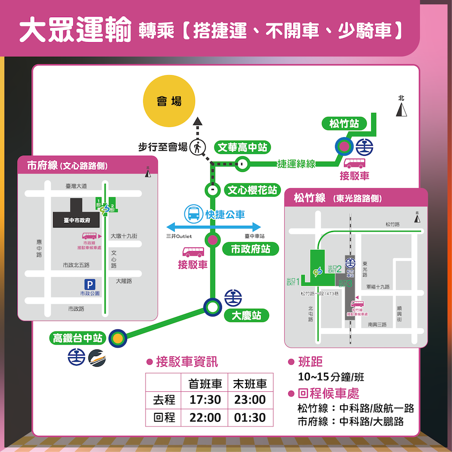 在交通方面,市府於甘肅路規劃人行專用通道,鼓勵民眾搭乘捷運並步行前往會場,另也提供市府線、松竹線2條免費接駁路線,串聯高鐵、台鐵及周邊停車場等重要轉運節點。接駁車自下午5時30分至晚間11時往返會場,回程服務時間為晚間10時至翌日凌晨1時30分,約10至15分鐘一班,坐滿或時間到即發車,提升疏運效率。