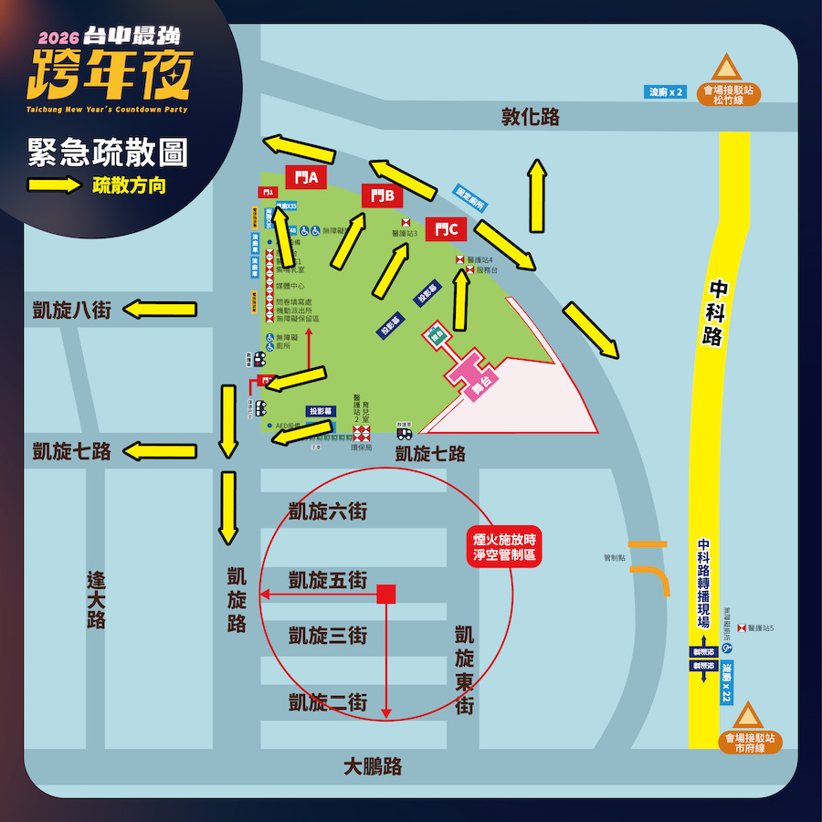 欒局長也強調,台中跨年晚會規模為全國最大,因應龐大參與人潮,市府全面升級維安層級,並已於昨(29)日完成跨局處聯合演練。活動當日將實施入場安檢,提醒民眾配合暫時脫口罩,切勿攜帶行李箱、易燃、易爆物品及刀械等危險物品;同時規劃兩種細胞簡訊機制,包含人數接近上限時的預防性通知,以及發生突發事件時的即時通報與疏散指引,請民眾收到簡訊時勿驚慌,並配合現場工作人員引導。