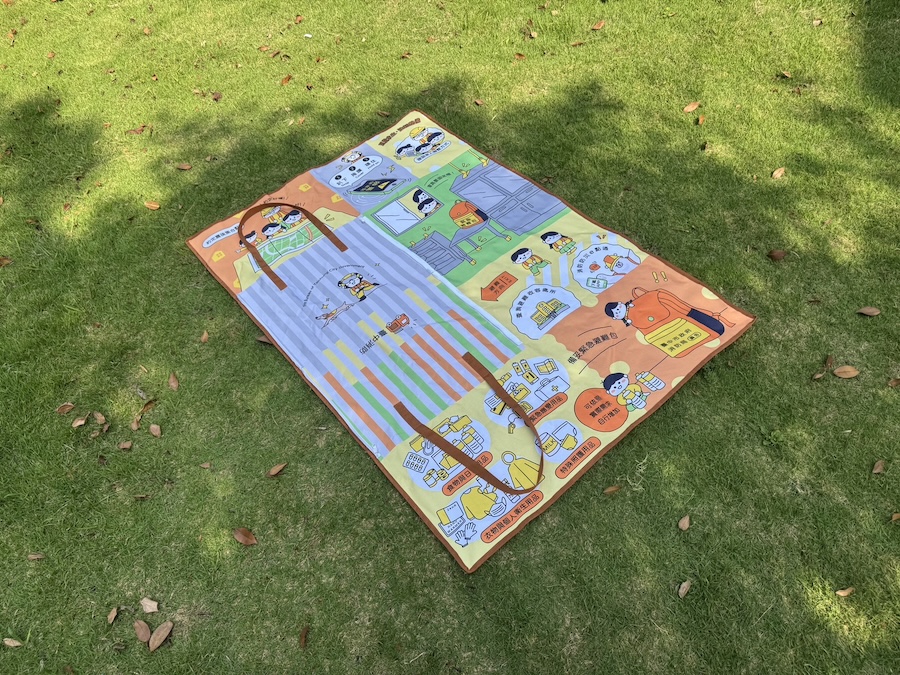 消防局指出,該多功能提袋可依家庭需求放置防災避難物品,平時也可作為戶外野餐使用。提袋攤開後即成為野餐墊,內側印製多項實用防災知識,包括緊急避難包應備物品、避難收容處所查詢及家庭集合點設定方式、地震發生時的「趴下、掩護、穩住」防災三步驟,以及居家家具固定等防震重點,讓家長與孩子在親近大自然的同時,也能自然交流並學習正確的防災觀念。