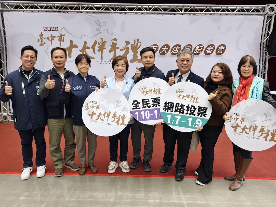 而週末於台中市政府廣場舉辦的現場票選暨市集展售活動將選出「十大伴手禮首獎」,分為糕餅烘焙組及特色文創組兩大類別,共計20名,並同步頒發官方認證的「好禮標章」給100名入圍店家,期盼協助業者提升品牌能見度、拓展市場商機。誠摯邀請民眾踴躍到場支持,一同見證頒獎典禮盛況。更多活動資訊與票選動態,請至「台中市十大伴手禮」官方網站(https://www.top10gifts.com.tw/)及FB粉絲專頁查詢(https://www.facebook.com/taichungtop10gifts/),邀請全國民眾相揪參與,共同選出最能代表台中的城市名片。