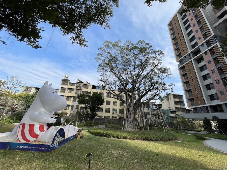 都發局住宅處長陳煒壬說明,「東區恊園好宅」基地前身為故總統行館「恊園」,園區內保留多棵珍貴老樹,規劃時以「與環境共生共融」為核心理念,主動縮減建築量體,保留約610坪的大面積開放綠地,打造結合鄰里公園概念的生態好宅。寬闊的綠意空間不僅延續基地原有的自然樣貌,也成為市民可親近、可停留的城市綠洲,與姆明一族(The Moomins)所象徵的森林、自然與療癒意象相呼應,因此特別規劃在東區恊園好宅設置姆明媽媽(Moomin Mama)氣模公仔,讓幸福角色走進生活角落,為城市增添溫暖與療癒的景象。
