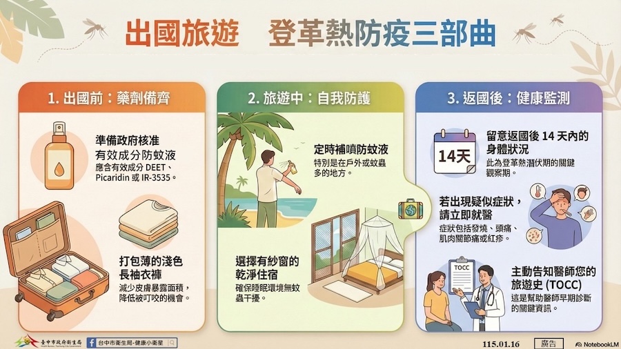 【記者張品君/台中報導】衛生福利部疾病管制署統計資料顯示,國際登革熱疫情持續嚴峻,其中越南於114年累計病例已超過15萬例,印度、斯里蘭卡等國亦分別累計超過10萬例及5萬例。因應115年春節9天連假將至,台中市政府衛生局提醒市民朋友,如規劃前往越南、印度、斯里蘭卡、泰國、菲律賓等登革熱流行地區,務必加強個人防護,穿著薄淺色長袖衣褲,並使用經政府核准、含敵避(DEET)、派卡瑞丁(Picaridin)或伊默克(IR-3535)等有效成分之防蚊藥劑,以維護自身及家人健康。