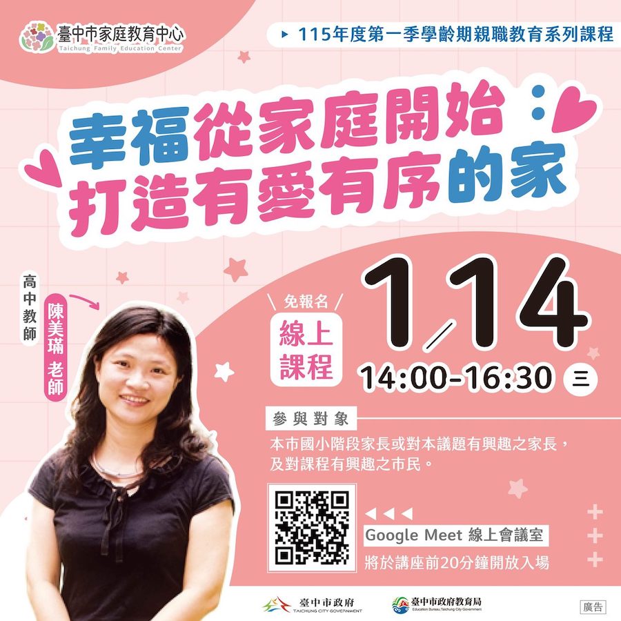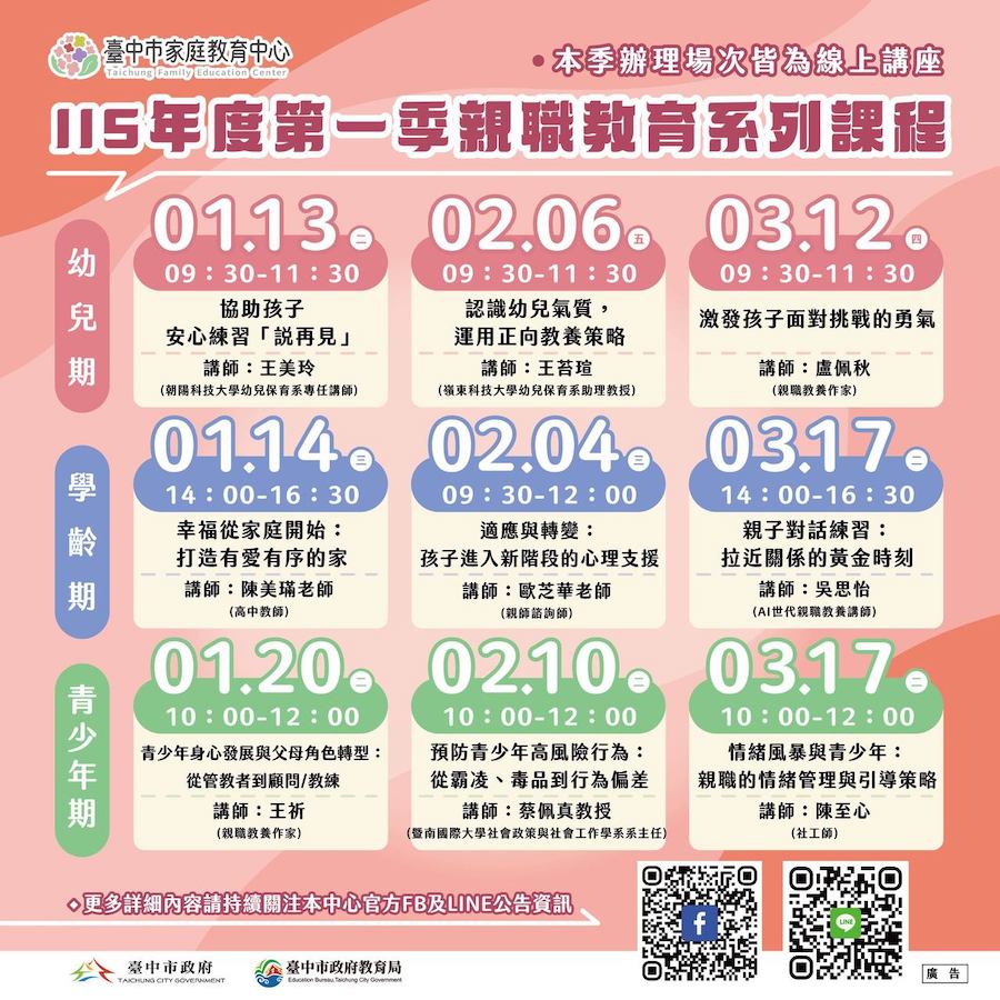 【記者李瑞華/台中報導】台中市政府為協助家長面對孩子各成長階段的教養挑戰,掌握孩子情緒發展與教養關鍵,家庭教育中心規劃115年度第一季「親職講座」系列課程,推出9場由專家傳授涵蓋幼兒期、學齡期及青少年期的教養方式,全數免費線上進行,家長可以不受時間與地點限制,彈性選擇適合孩子年齡的場次參與。