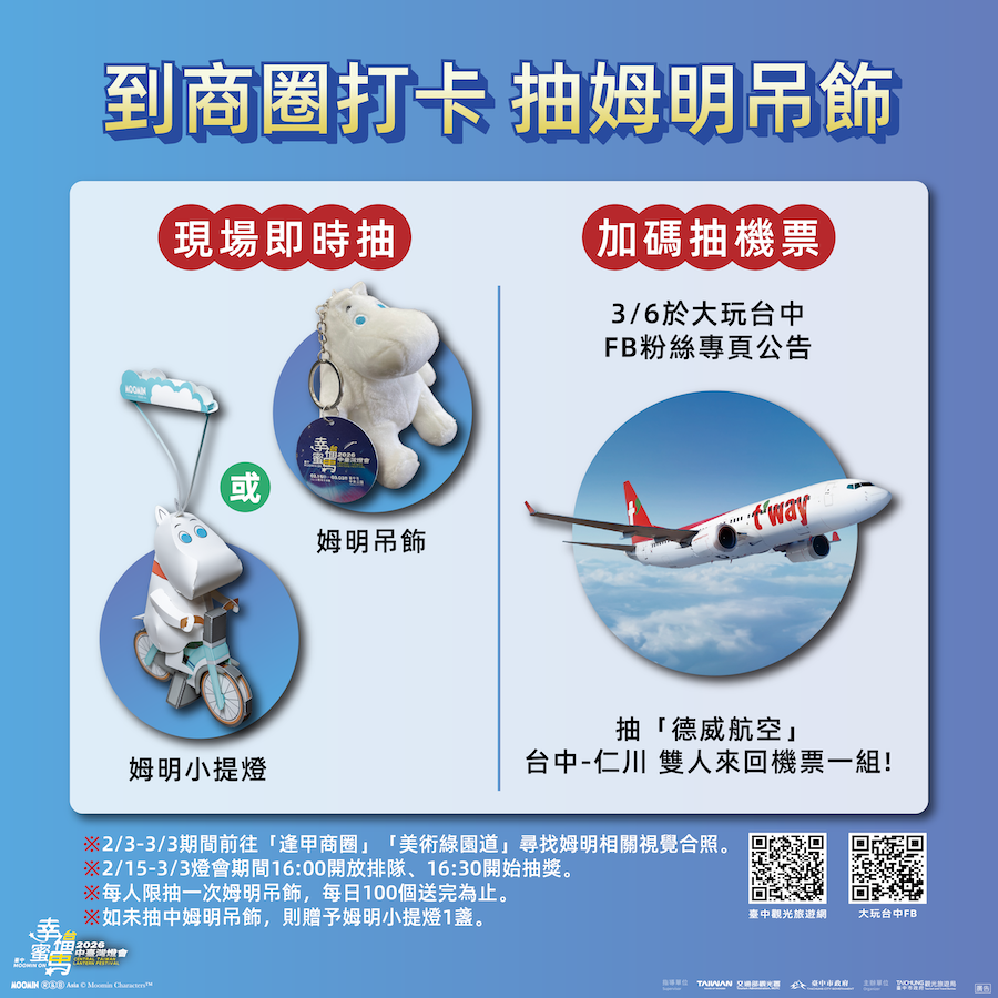 中台灣燈會未演先轟動,觀旅局補充,可愛又應景的「姆明小提燈」成了話題新寵,這週2月7日第二波「拍姆明、送姆明」活動,將於台中市中央公園再免費送出1,000盞小提燈,想先入手的朋友請把握機會!此外,燈會周邊小物還有「姆明吊飾」也等著大家來收藏,即日起至合作商圈(逢甲商圈、美術園道商圈)找姆明合照打卡,並於大玩台中FB指定貼文留言分享打卡截圖,燈會期間即可至2號服務台參加抽獎,新年開春歡迎來碰碰運氣,把超萌的姆明吊飾抽回家!燈會最新消息及更多旅遊資訊,歡迎上台中觀光旅遊網(https://travel.taichung.gov.tw/zh-tw/event/activitydetail/9975)查詢。