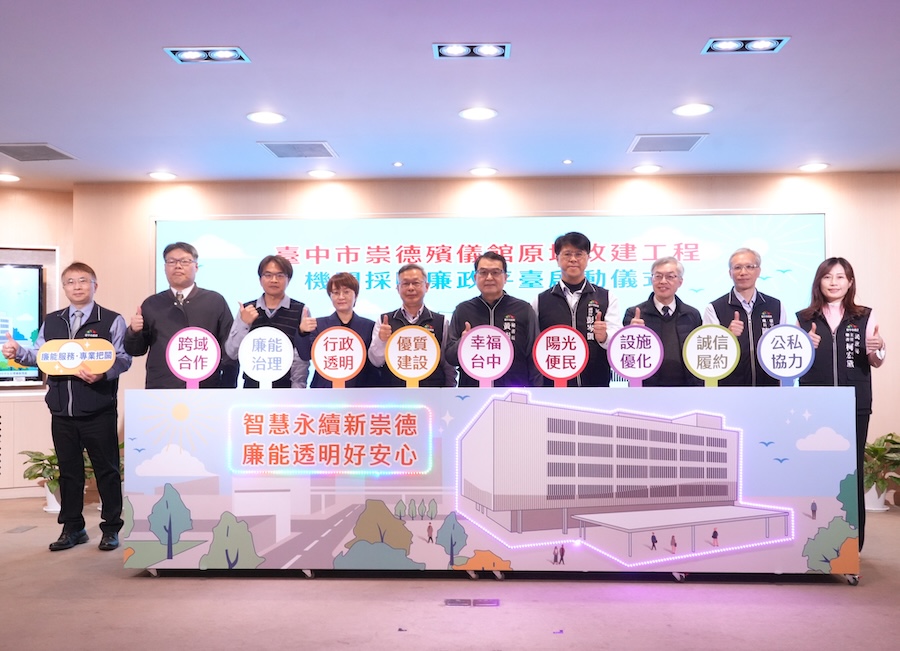 【記者吳靜/台中報導】台中市崇德殯儀館服務市民逾半世紀,因館舍老舊及治喪需求提升,市府投入總經費近42.6億元,規劃原地改建為地上6層、地下4層的現代化殯儀館,並由建設局及新建工程處辦理工程採購與營建督導。為確保重大公共工程品質並強化採購廉能與行政透明,市府今(9)日啟動機關採購廉政平台,結合司法機關與專家學者外部監督,導入風險控管機制,建構透明廉能的作業環境,確保工程順利推動並保障各方合法權益。