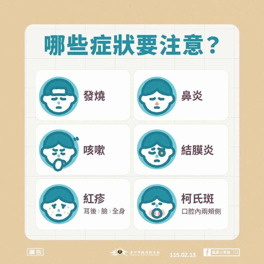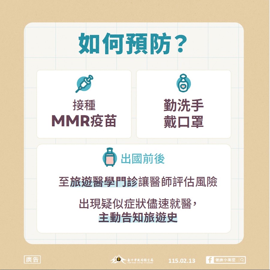 【記者詹姆士熊/台中報導】台中市政府衛生局今(13)日接獲疾病管制署通知,新增一名境外移入麻疹確診者,為台中市115年首例境外移入麻疹確診案,該個案可傳染期無公共場域活動足跡,初步匡列接觸者48人,市府衛生局將持續健康追蹤,全案預計監測至3月4日止。