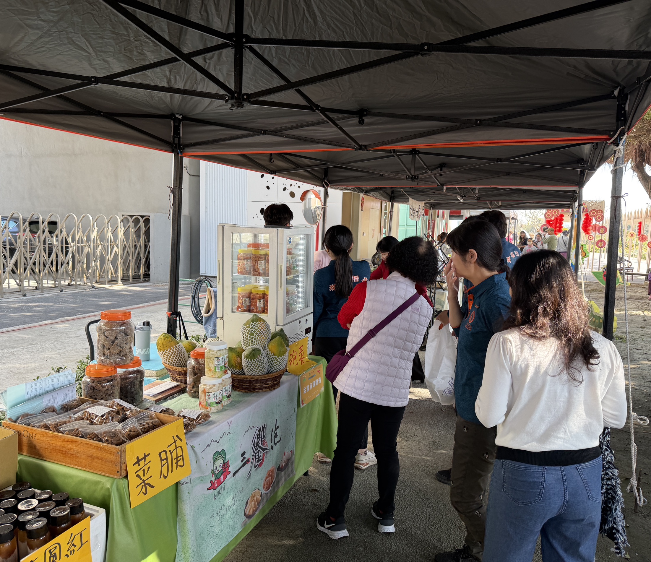 農民市集攤位展售在地農產加工品-吸引民眾駐足選購-現場買氣熱絡