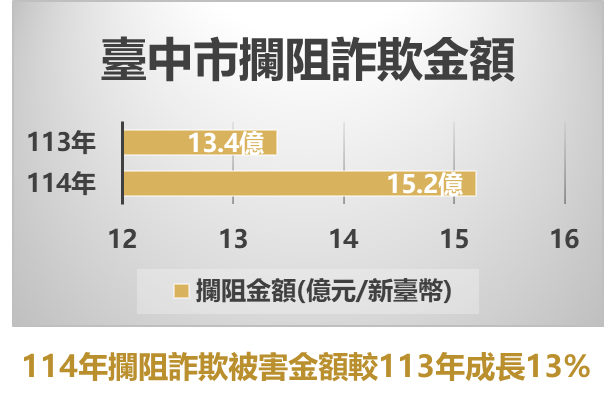 臺中市長盧秀燕於治安會議中頒發「臺中市成功攔阻詐騙案件有功人員」感謝狀,表揚金融機構人員、地政人員、員警。特別感謝銀行、超商以及民間團體長期配合協助警方打詐,另外,雅潭地政事務所蕭姓課員於受理民眾設定不動產業務時,察覺其資金用途及還款條件明顯不合理,研判可能遭遇詐騙,隨即通報警方到場協助,成功攔阻詐騙金額460萬元,避免民眾蒙受重大財產損失。根據最新統計,臺中市114年1-12月攔阻詐欺案件2,421件,攔阻金額約15億餘元,與113年同期比較攔阻金額增加13%,顯示在市府整體統籌下,警政機關與各局處、金融機構密切合作,已逐步建構完善的跨機關防詐聯防網絡。