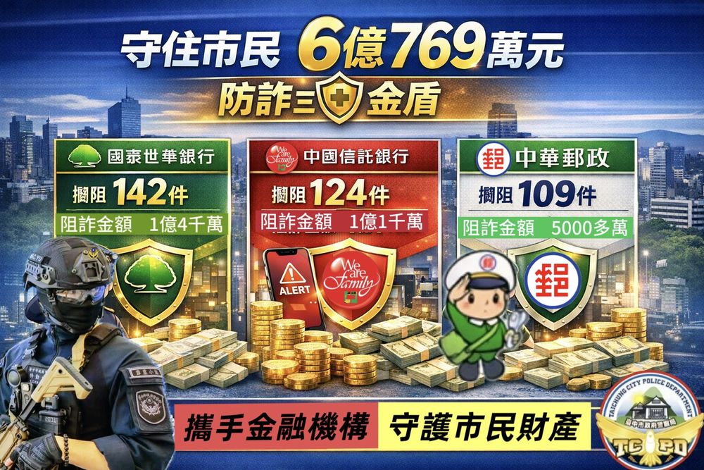 【記者詹姆士熊/台中報導】詐騙手法層出不窮,但臺中市守護市民財產的決心更堅定,警察局公布114年7月至12月金融機構攔阻詐騙成果,成功阻止 761件詐騙案件,攔阻金額高達 6億769萬元,為市民守住辛苦積蓄。盧市長於今(115)年市府第一次治安會報中,特別公開表揚臨櫃阻詐成效最亮眼的三家金融機構:包括半年內成功攔阻142件、阻詐金額超過1億4千萬元的國泰世華商業銀行;攔阻124件、阻詐金額逾1億1千萬元的中國信託商業銀行;以及攔阻109件、守住民眾5千多萬元的中華郵政公司,這三家金融機構不僅件數高,阻詐金額也相當可觀,是本市防詐最堅強的防線。