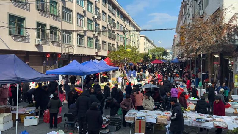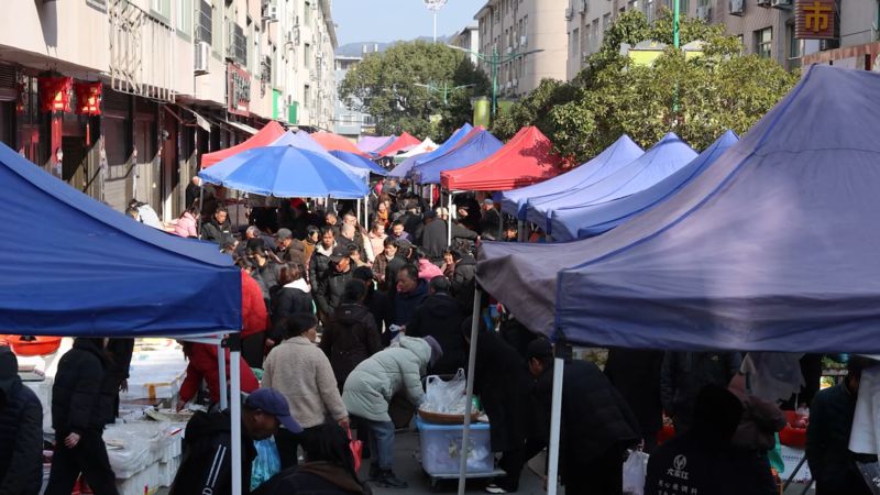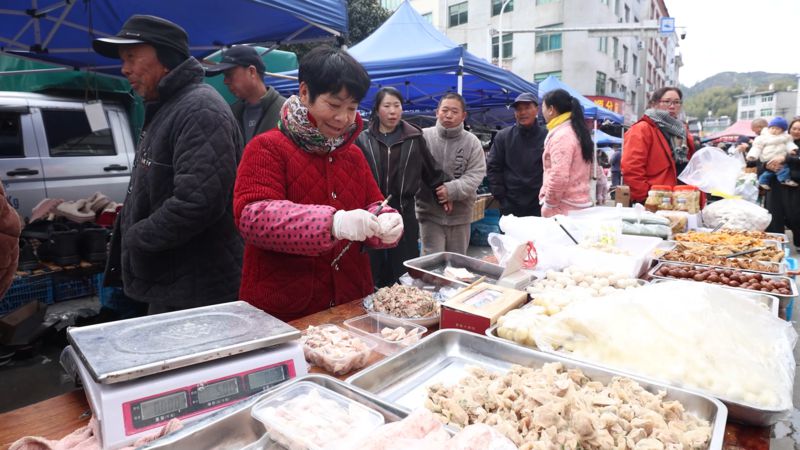 「新鮮的蔬菜,剛從山裡挖的!」「西陽肉片,做了幾十年的西陽肉片勒,還是老味道!」吆喝聲此起彼伏,閩浙兩地的鄉音交織在一起,成了西陽墟市最動人的主旋律。攤主們熱情地招呼著顧客,熟絡的鄉親們見面就寒暄,一句「回來啦」,一聲「新年好」,簡單的話語裡,藏著最樸素的牽掛。