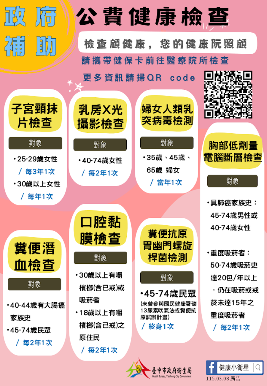 曾局長呼籲,健康管理應從「主動預防」開始,市民應將定期健康檢查納入年度規劃,落實「早期篩檢、早期發現、早期治療」。符合篩檢資格的民眾,可攜帶健保卡至健保特約醫療院所接受檢查。更多癌症篩檢資訊與合約醫療院所名單,可至台中市政府衛生局官網查詢,或追蹤官方臉書粉絲專頁「健康小衛星」,即時掌握健康資訊,守護自己與家人的幸福人生。