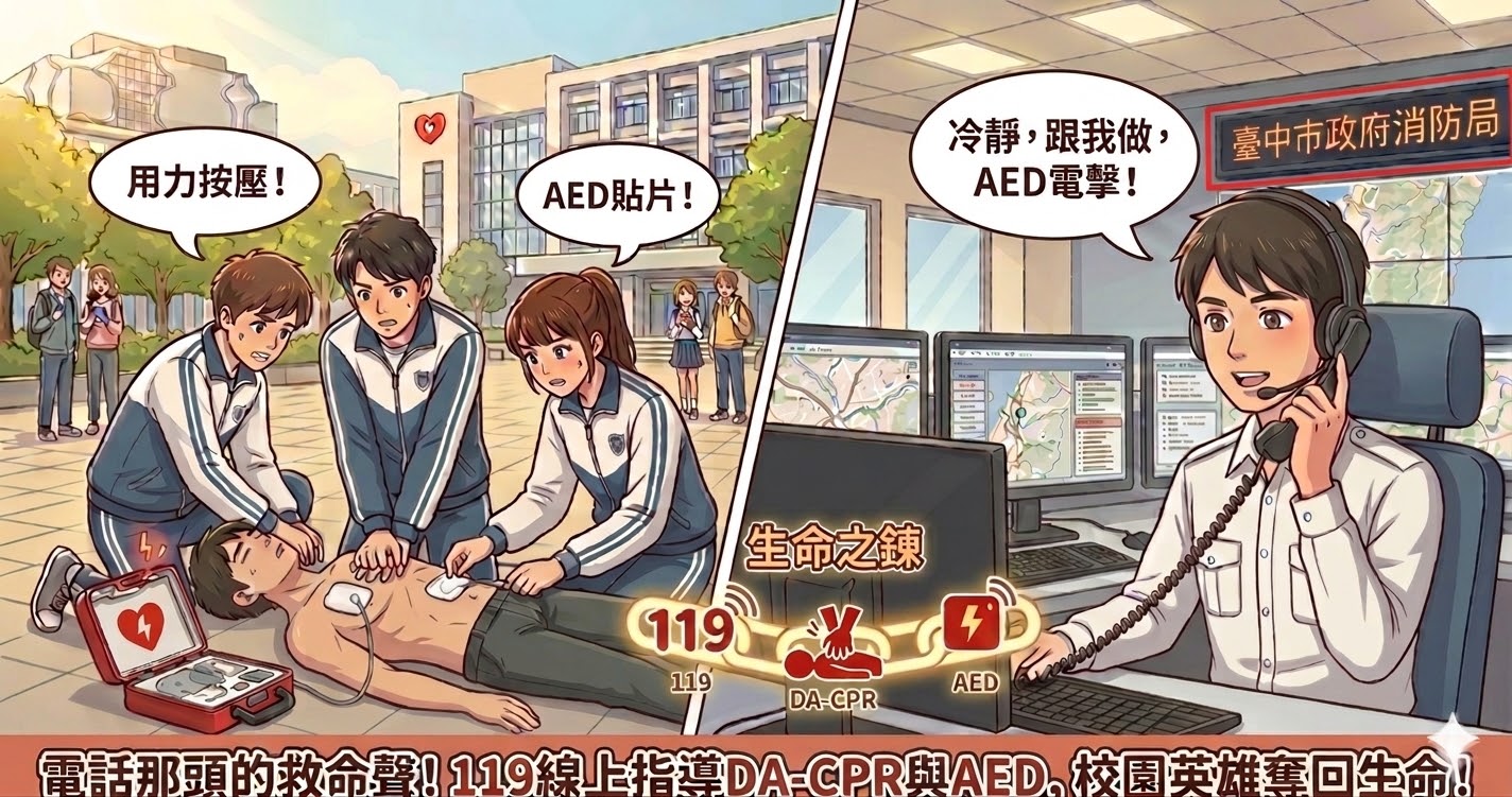 【記者詹姆士熊/台中報導】當民眾倒下、呼吸心跳停止(OHCA)的瞬間,救護車抵達前的「空窗期」往往是救命關鍵。台中市政府消防局表示,日前台中市一名大學生在校園內突發癲癇並失去呼吸心跳,所幸消防局119指揮中心派遣員透過電話實施「線上指導心肺復甦術(DA-CPR)」,並引導現場人員取得且正確操作AED完成電擊,成功在救護人員趕抵前完成至關重要的搶救作為。