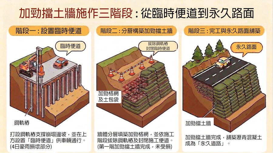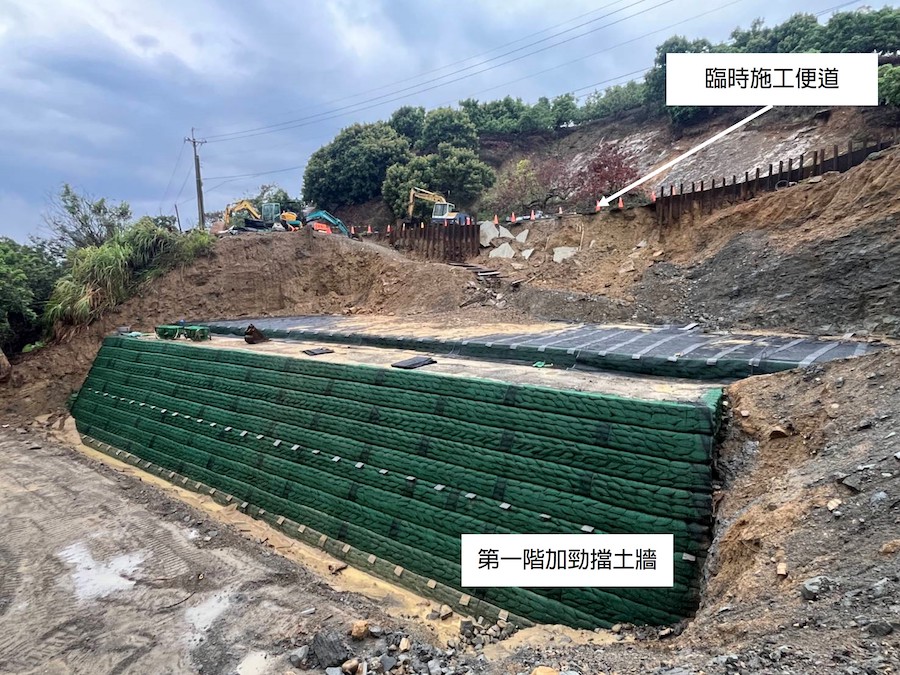 水利局進一步表示,此次豪雨雖造成便道受損,但不影響主體工程,已提前啟動封路機制,確保用路人安全。後續將加速推進第二、第三階段加勁擋土牆施作,並銜接永久路面鋪設作業,預計於今年5月30日前完工,完工後將提升道路通行安全與邊坡穩定。