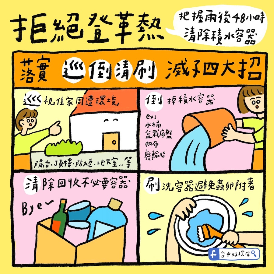 環保局說明,近兩年透過評比機制,針對各區公所及清潔隊在防治作為、衛教宣導及病例控制等面向進行量化評核,同時推動每週六「清淨家園日」,並強調雨後48小時內清除積水容器的關鍵時機,全面提升防疫量能。
