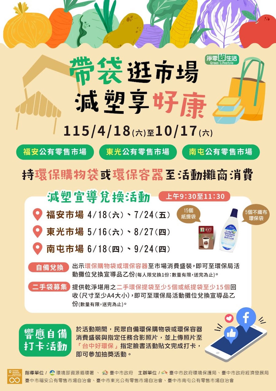環保局表示,為加強源頭減塑宣傳及提升民眾參與意願,環保局今年結合台中市福安、東光及南屯等3處公有零售市場配合展開6場次巡迴設攤活動。此外,為減少使用塑膠袋,呼籲攤商響應不主動提供購物用塑膠袋及併袋盛裝,也鼓勵民眾外出購物時自備攜帶購物袋,省荷包又環保;若臨時有購物袋需求,可至市場、量販店、藥局及超市等276處「二手袋循環回收站」取用,有多餘的袋子亦可捐袋回收;環境部資源循環署近期也推出「袋袋相傳」二手袋循環平台(網址:https://sup.moenv.gov.tw/Page/rebag),歡迎有捐袋意願者或有二手袋需求商家,可上該平台了解及登錄,讓資源循環共享不浪費。