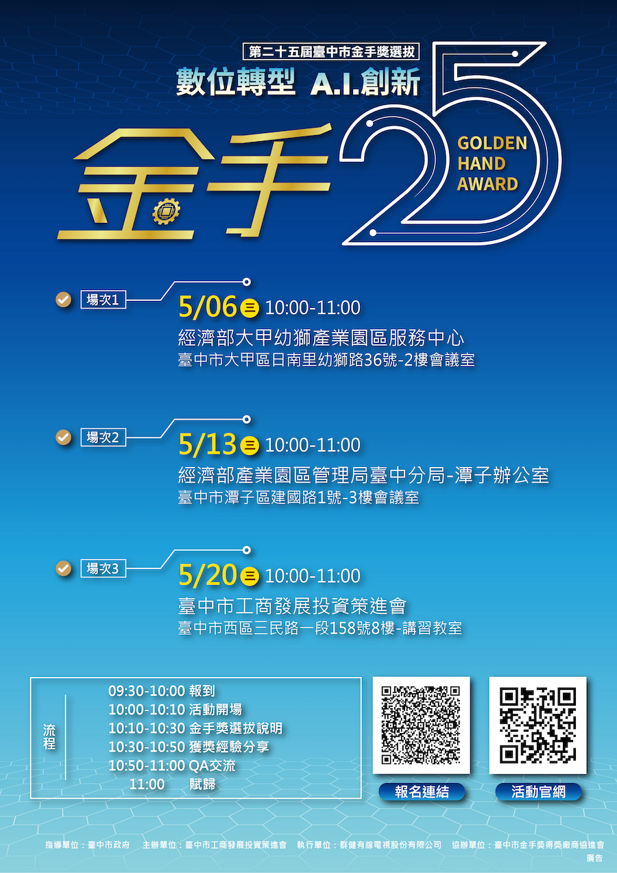 【記者張品君/台中報導】「第25屆台中市金手獎」即日起受理報名至6月15日止!台中市工商發展投資策進會誠摯邀請符合資格的在地中小企業製造業踴躍參與,在延續「黑手變金手」產業精神的同時,展現導入AI科技、推動智慧製造升級的轉型成果。