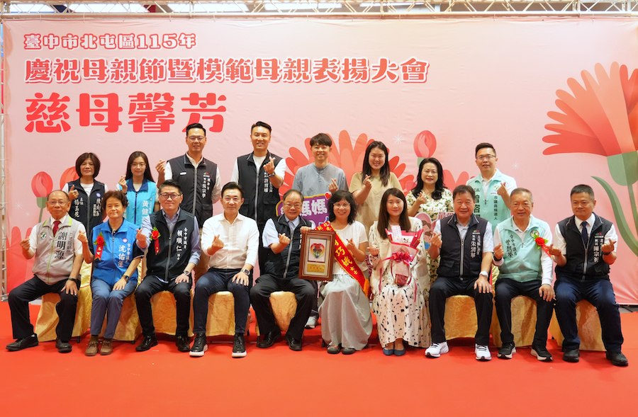 【記者詹姆士熊/台中報導】溫馨母親節將至,台中市北屯區公所今(26)日於公所6樓大禮堂舉辦「115年度台中市慶祝母親節暨模範母親表揚活動」,54位模範母親在子女、孫輩陪同下出席受獎並合影,感受溫馨光榮的一刻。台中市政府民政局長吳世瑋代表市長盧秀燕頒發「慈母馨芳」獎牌,向所有辛勞偉大的母親致上最深敬意,感謝她們長年為家庭無私奉獻,並祝福全天下媽媽母親節快樂、幸福安康。